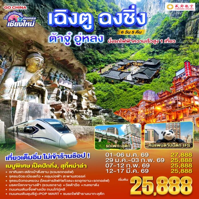 ทัวร์จีน เฉิงตู ฉงชิ่ง ต้าจู๋ อู่หลง 6 วัน 5 คืน