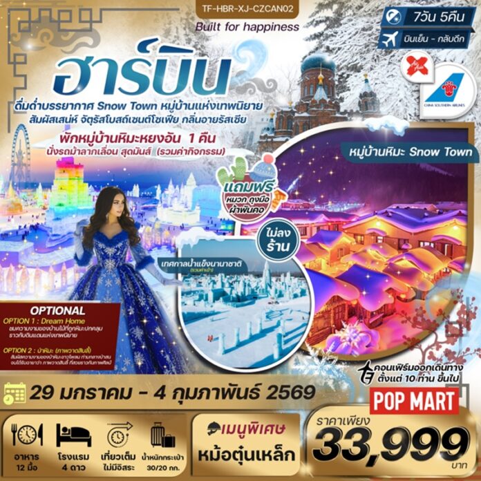 ฮาร์บิน-ร้านเสื้อกันหนาว- เข้าที่พัก-หมู่บ้านหิมะ Xuexiang (รวมค่าเข้า รถรับ-ส่ง)-ป้ายหินใหญ่-พิพิธภัณฑ์หมู่บ้านหิมะ + ที่ทำการไปรษณีย์เมืองหิมะ-ถนนเสวี่ยยุ่นเจีย Option: Dream Home (ราคา 198 หยวน)
